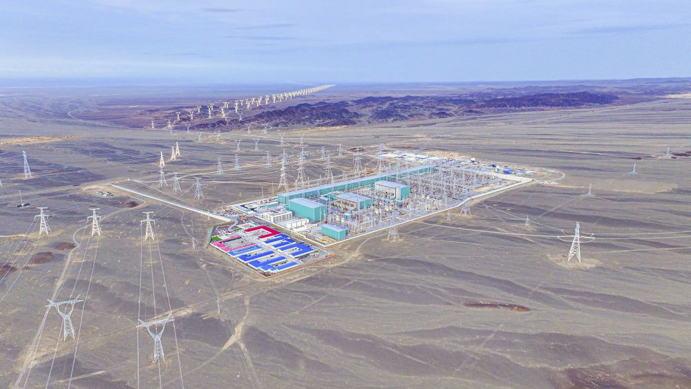 9月22日在新疆巴音郭楞蒙古自治州若羌縣拍攝的三峽集團(tuán)"疆電外送"第四通道電源項(xiàng)目施工現(xiàn)場(無人機(jī)照片)。