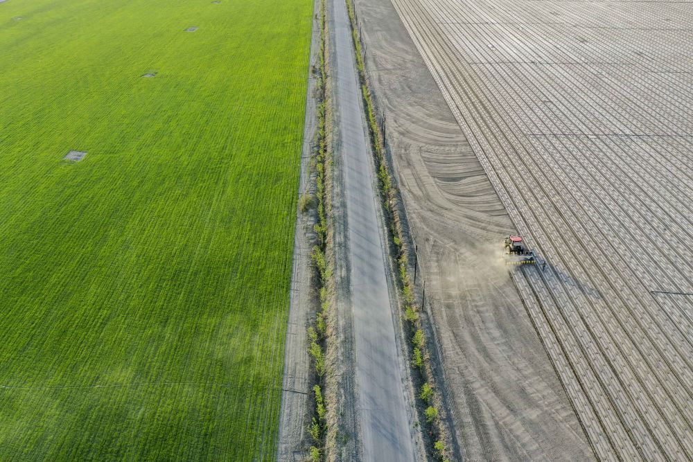 棉農(nóng)在新疆沙灣市大泉鄉(xiāng)五道河子村的棉田春播,一旁的小麥長(zhǎng)勢(shì)良好(2022年4月17日攝)。