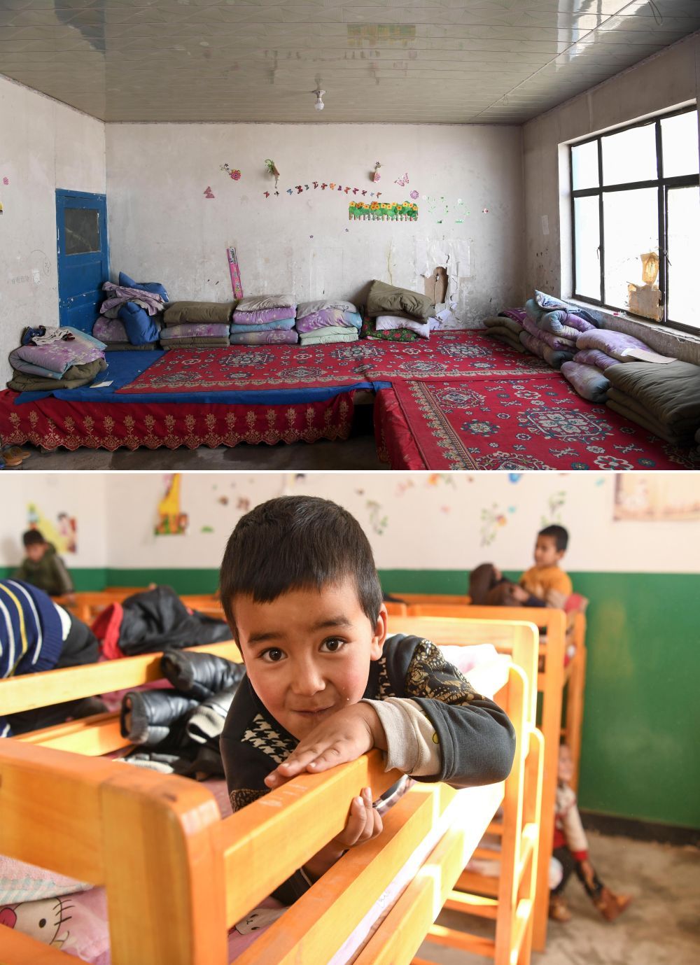 拼版照片:上圖為易地扶貧搬遷前的于田縣達(dá)里雅布依鄉(xiāng)學(xué)校學(xué)生宿舍(2018年9月5日攝);下圖為5歲的阿不都沙拉木·庫(kù)爾班在新學(xué)校午休(2019年11月19日攝)。