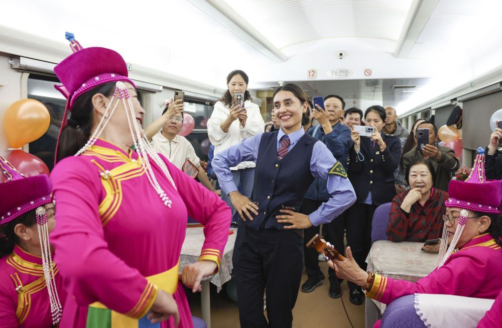 在由喀什開(kāi)往成都西的列車(chē)上,艾爾開(kāi)牙·多力開(kāi)與民間藝人一起為乘客跳舞(2024年4月19日攝)。