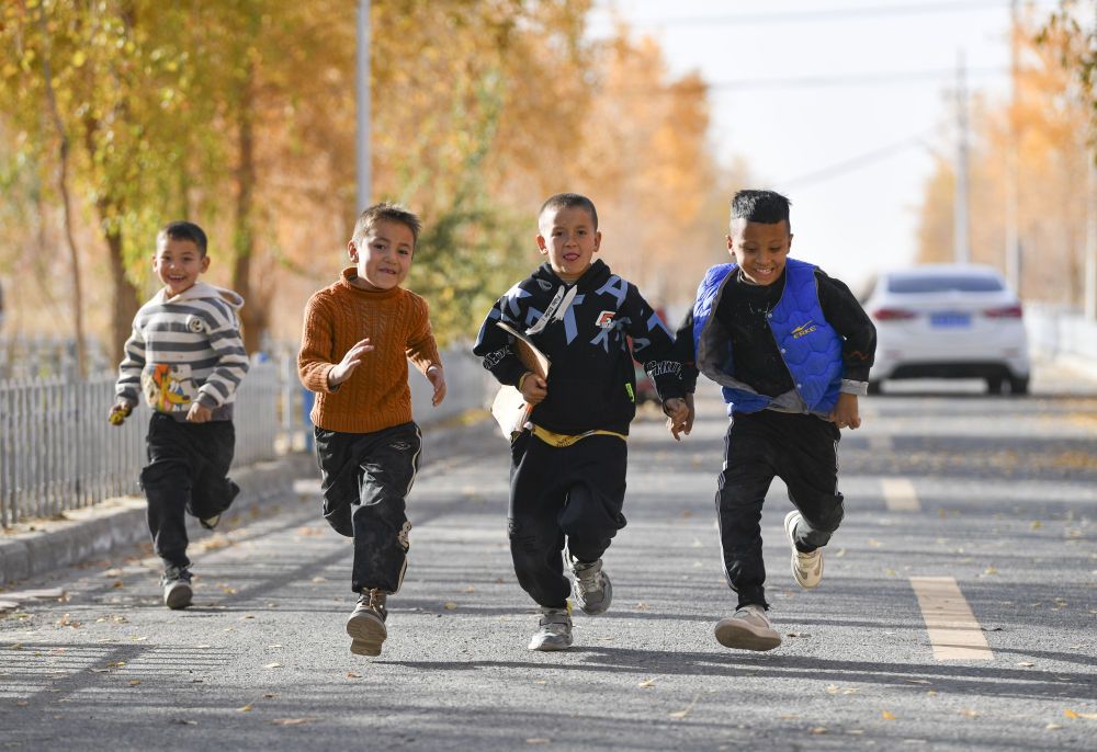 小朋友奔跑在新疆于田縣達(dá)里雅布依新村(2024年11月9日攝)。