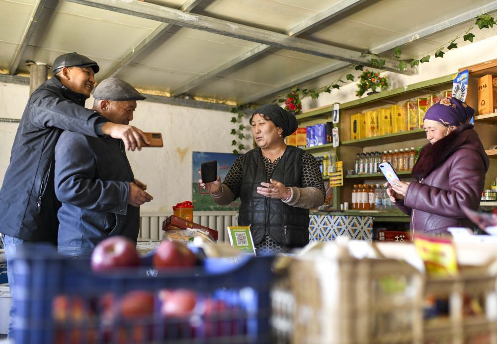 周邊牧民來(lái)到家中買(mǎi)東西,巴哈提(右二)向顧客展示收款到賬界面,和大伙兒聊天(2023年2月15日攝)。