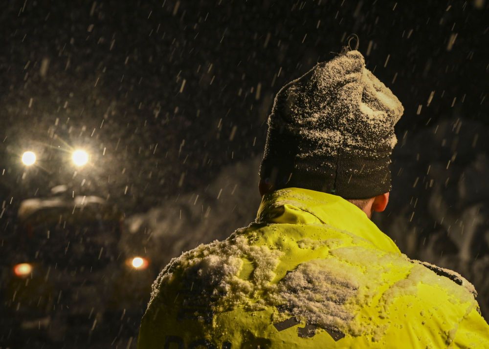 新疆喀納斯景區(qū)公安局交警大隊(duì)民警馬國(guó)軍在一處山路雪崩救援現(xiàn)場(chǎng)工作(2023年1月8日攝)。
