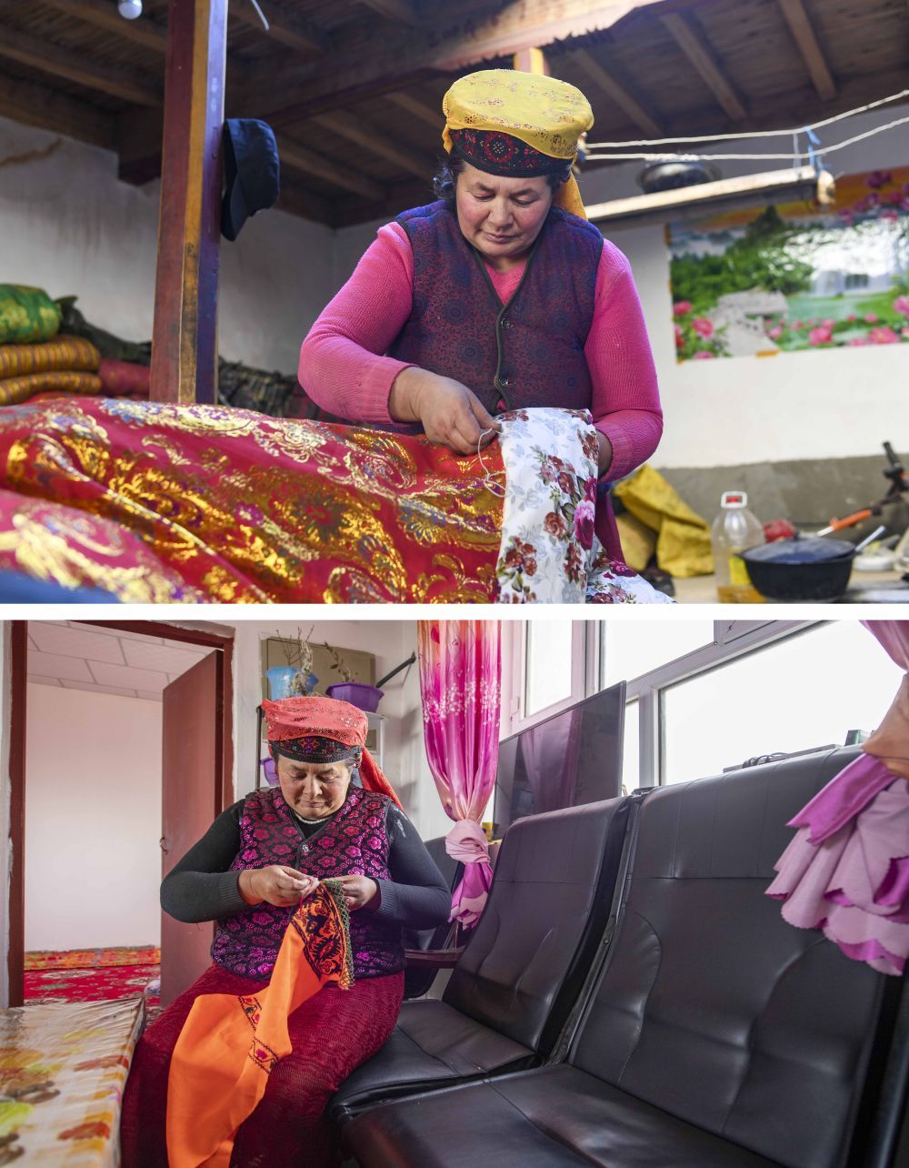 拼版照片:上圖為都熱·加爾曼的妻子那尼克·苦卡尼在山谷舊居中縫制搬遷后需要使用的新被子(2018年11月13日攝);下圖為那尼克·苦卡尼在愛(ài)民村的新家中制作手工刺繡(2020年6月3日攝)。