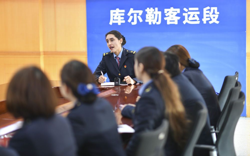 在中國(guó)鐵路烏魯木齊局集團(tuán)有限公司庫(kù)爾勒客運(yùn)段辦公樓,艾爾開(kāi)牙·多力開(kāi)帶領(lǐng)同事開(kāi)展值乘前的業(yè)務(wù)學(xué)習(xí)(2025年1月15日攝)。