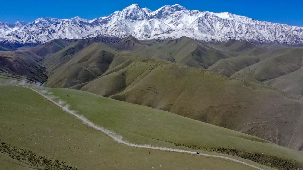 汽車(chē)疾馳在位于昆侖山北麓的新疆策勒縣一處高山牧場(chǎng)道路上(2019年5月31日攝,無(wú)人機(jī)照片)。近年來(lái),新疆偏遠(yuǎn)牧區(qū)的出行條件得到改善。