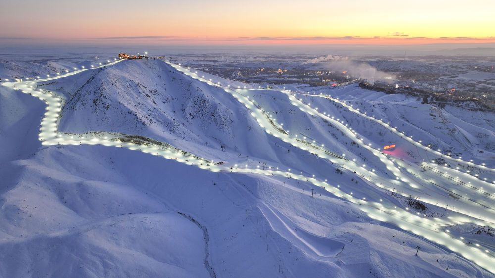 黃昏時(shí)分的將軍山國(guó)際滑雪度假區(qū)(2025年1月24日攝)。將軍山國(guó)際滑雪度假區(qū)在夜間開(kāi)放多條雪道,以滿足"雪友"多樣化需求。