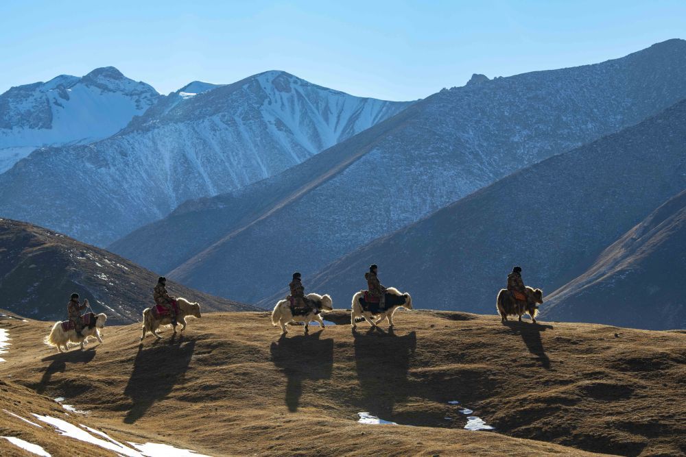 新疆生產(chǎn)建設(shè)兵團(tuán)第三師圖木舒克市葉城二牧場(chǎng)三連的干部職工騎著牦牛行進(jìn)在巡邊路上(2020年12月25日攝)。
