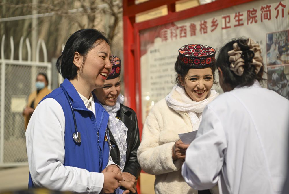 在新疆塔縣庫(kù)科西魯格鄉(xiāng)衛(wèi)生院,深圳援疆新生兒科醫(yī)生潘千(左一)與村民、鄉(xiāng)衛(wèi)生院醫(yī)護(hù)人員交流(2025年3月24日攝)。