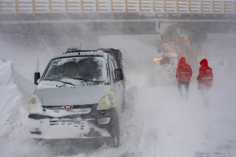 瑪依塔斯防風(fēng)雪搶險(xiǎn)基地的工作人員頂風(fēng)冒雪搜尋被困旅客(2021年1月23日攝)。