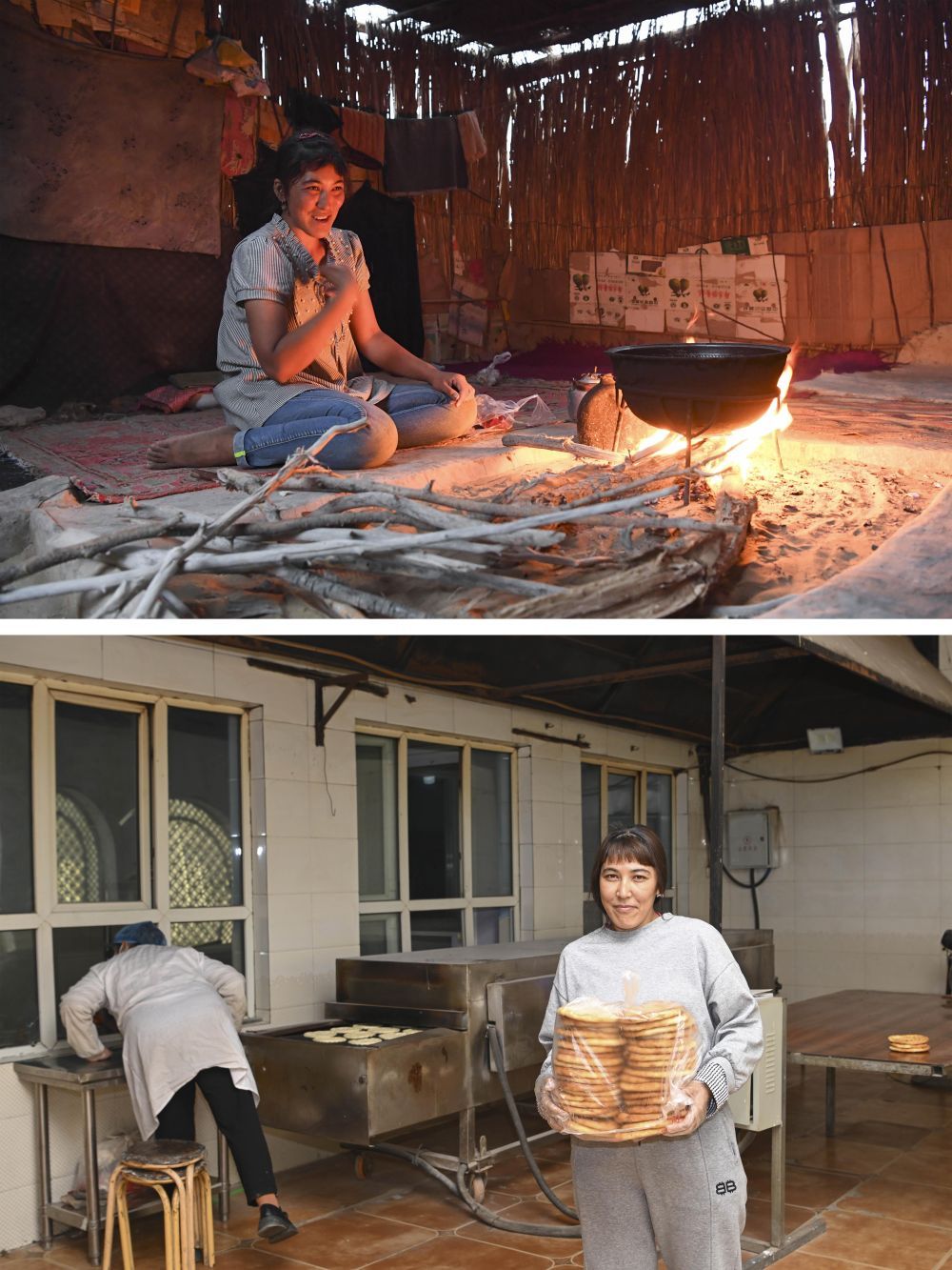 拼版照片:上圖為搬遷前,達(dá)里雅布依村村民古麗巴哈爾·阿不都拉在家中做飯(2018年9月4日攝);下圖為古麗巴哈爾·阿不都拉在于田縣的一家打馕店上班(2024年11月11日攝)。