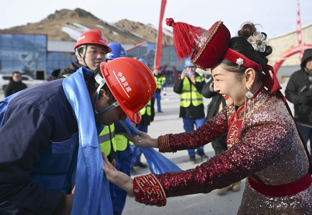 在位于新疆和靜縣的天山勝利隧道出口,和靜縣烏蘭牧騎隊(duì)演員(右)向施工方代表敬獻(xiàn)哈達(dá)(2024年12月30日攝)。當(dāng)日,世界上最長(zhǎng)的高速公路隧道——天山勝利隧道全線貫通。