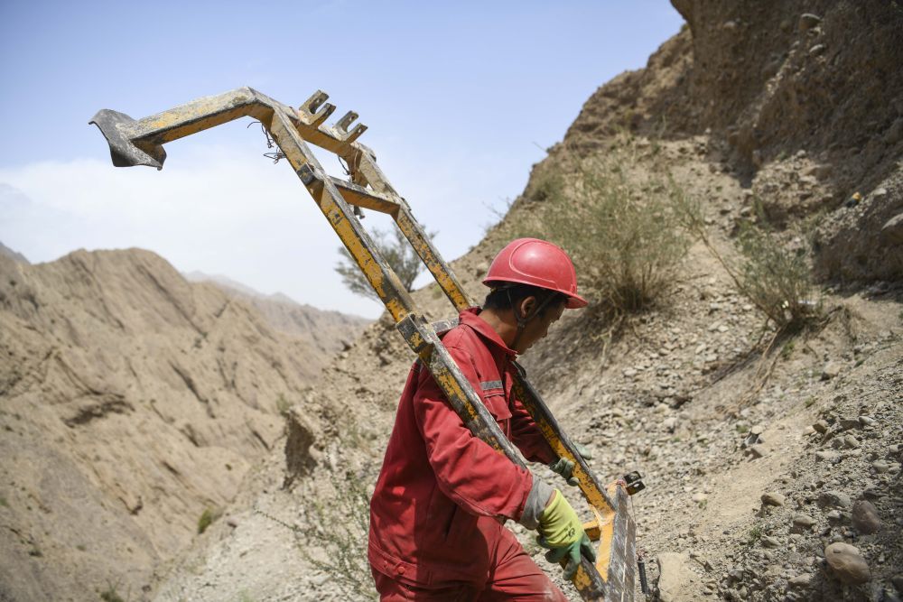 電力工人在新疆塔什庫(kù)爾干塔吉克自治縣的深山中安裝用于放線的零件(2019年11月23日攝)。