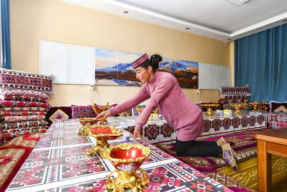 新疆塔什庫(kù)爾干塔吉克自治縣塔什庫(kù)爾干鄉(xiāng)瓦爾希迭村村民瑪依努爾古麗·依克木在民宿內(nèi)擺放物品,準(zhǔn)備招待游客(2020年6月4日攝)。