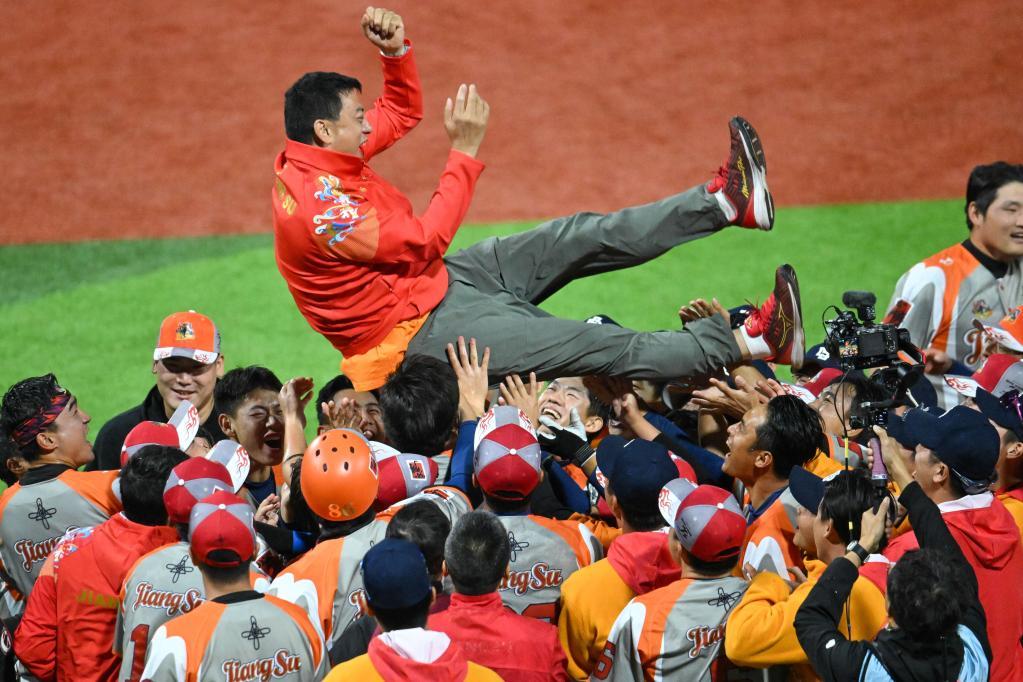 11月20日,江蘇隊成員在棒球1-2名決賽后慶祝奪冠。