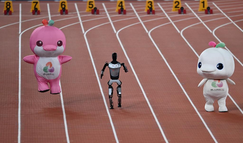 11月17日,在田徑項目賽事開始前的暖場活動中,機器人和吉祥物喜洋洋、樂融融在廣東奧體中心體育場賽跑。