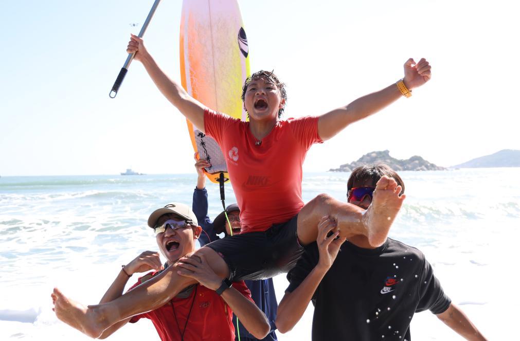 11月16日,四川隊選手楊思琪(上)在沖浪女子短板決賽后慶祝。
