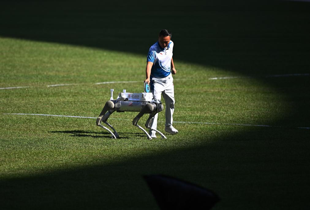 11月16日,在田徑男子十項全能鐵餅比賽中,機器人在運送鐵餅。