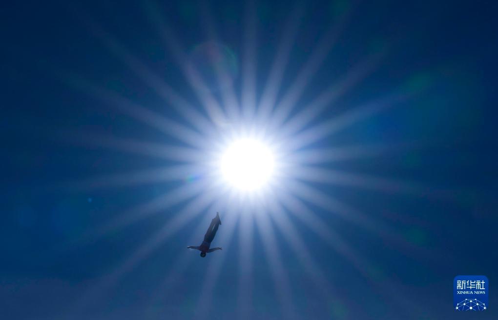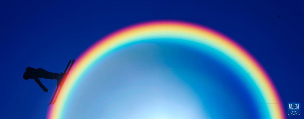 2012年1月7日,第12屆全國冬季運動會自由式滑雪空中技巧規(guī)定動作的比賽在吉林市北大壺滑雪場舉行。圖為齊齊哈爾市隊的女選手孔凡鈺在比賽中進行空中翻轉(zhuǎn)時,仿佛從太陽的光暈上滑下來。新華社記者費茂華攝