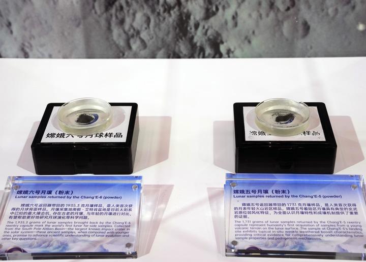 2025年11月5日在第八屆進(jìn)博會(huì)國家展中國館拍攝的“嫦娥五號(hào)”月壤和“嫦娥六號(hào)”月壤。新華社記者 劉穎 攝