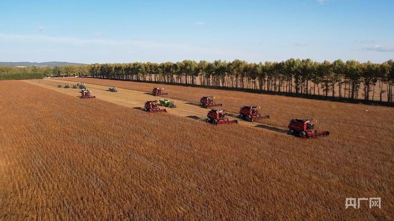 在鶴崗市蘿北縣,大馬力機車正在收獲大豆(央廣網(wǎng)發(fā) 李晟 攝)
