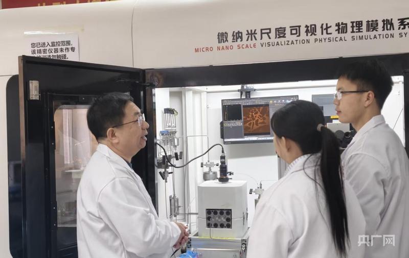 吳景春(左一)與團隊成員正在討論頁巖油采收技術(shù)(央廣網(wǎng)記者 陳顯春 攝)