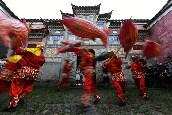 五夫龍魚戲表演 五夫鎮(zhèn)文化站供圖 “龍魚戲”是流傳于武夷山市五夫鎮(zhèn)的一種傳統(tǒng)民間文化表演活動,原為蓮魚戲,始于五代,興于兩宋,是鄉(xiāng)人迎春納福,祈求風(fēng)調(diào)雨順、國泰民安的民俗活動,后因朱熹喜登進(jìn)士,又添入"鯉魚跳龍門"的內(nèi)容,鼓勵后生向朱熹學(xué)習(xí),至今已有上千年歷史。 五夫龍魚戲的表演簡明易懂,舞姿設(shè)計古樸而原始,帶有明顯的古閩越族文化元素的特征,是中國勞動人民智慧的結(jié)晶,加上其道具制作精美、彩繪大膽,使得它在千百年的傳承中散發(fā)出獨特的人文魅力,成為閩北地區(qū)眾多民間文化表演中的一朵奇葩。 但由于歷史原因,五夫龍魚戲這一民俗傳統(tǒng)曾一度銷聲匿跡。21世紀(jì)初,在武夷山市委、市政府對民間藝術(shù)的高度重視下,五夫文化站對這一民俗進(jìn)行重新挖掘整理,2011年被列入福建省級非物質(zhì)文化遺產(chǎn)名錄(傳統(tǒng)舞蹈類)。 |