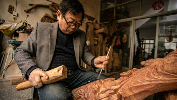 一塊實(shí)木板上放著鑿、雕刀、鋸、鉆等工具,匠人沉浸于雕刻中,選材、設(shè)計(jì)、打胚、修光……