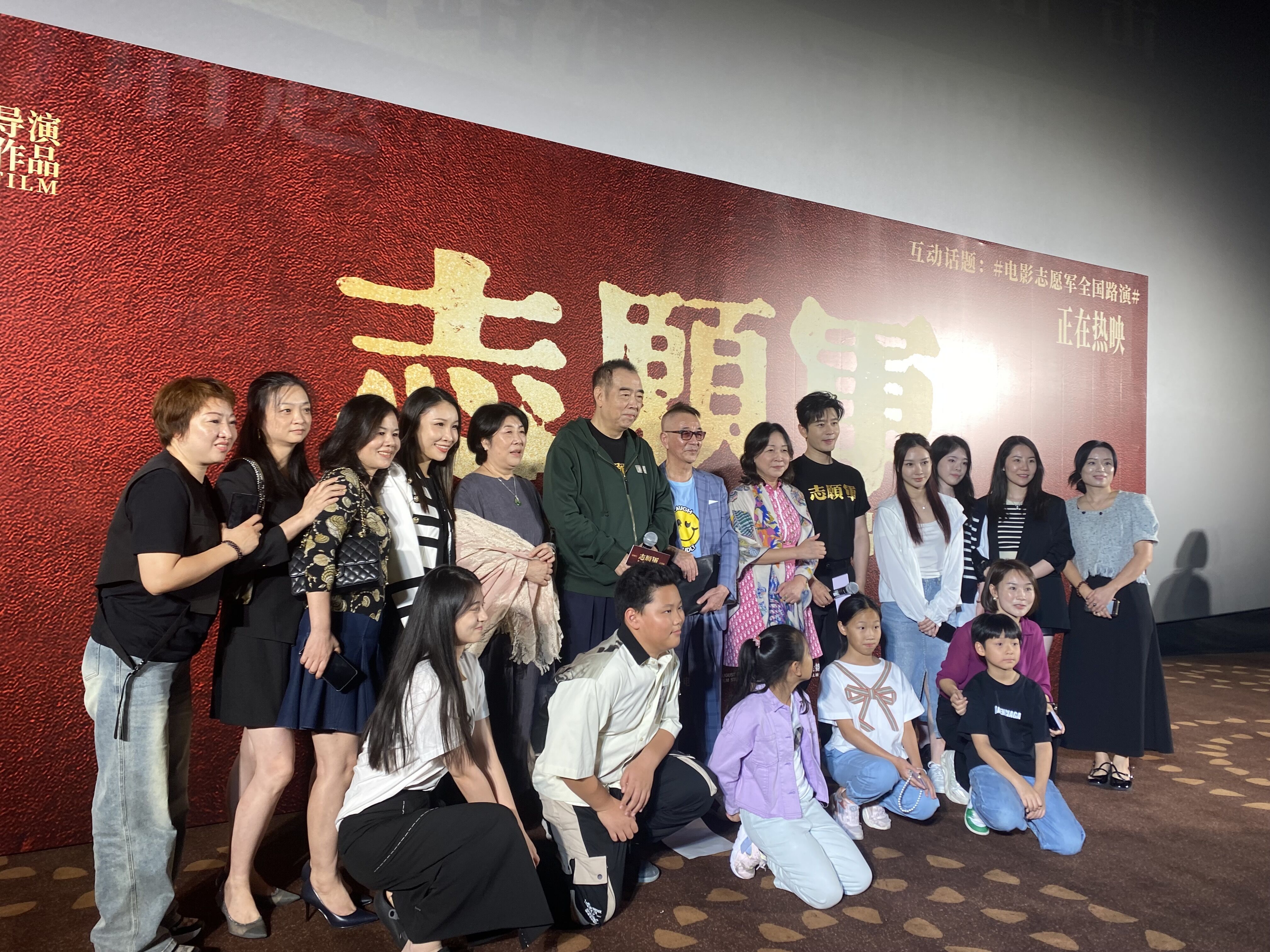 當(dāng)天在倉(cāng)山萬(wàn)達(dá)影城見(jiàn)面會(huì)之前,片方先安排了觀影環(huán)節(jié),電影《志愿軍:雄兵出擊》制作精良,真摯的情感表達(dá)和震撼的視聽(tīng)效果,讓觀眾在電影播放完畢時(shí),集體抱以熱烈的掌聲。 隨后,陳凱歌與黃曉明進(jìn)場(chǎng)與觀眾互動(dòng)。陳凱歌一上來(lái)就以一句不標(biāo)準(zhǔn)的福州話“大家丫好嗎?”許多觀眾用福州話回應(yīng):“好??!好啊!”陳凱歌坦言:“真的很慚愧,我是福州人,但竟然不會(huì)說(shuō)福州話,剛才那一句還是現(xiàn)學(xué)的。聽(tīng)到大家有反應(yīng),謝謝啊!” 陳凱歌“劇透”了現(xiàn)場(chǎng)有他的親戚,他指到一個(gè)名叫”花姐“的女觀眾。他說(shuō):”我知道‘花姐’你是黃曉明的粉絲,你給我說(shuō)五遍了,最熱切的愿望就是和黃曉明拍張照片,今天我走一下后門(mén),就來(lái)拍一張?!耙慌缘狞S曉明微笑著點(diǎn)了點(diǎn)頭,許多黃曉明粉絲羨慕不已。 接著陳凱歌還爆料,他表哥也來(lái)現(xiàn)場(chǎng)了。陳凱歌的表哥陳祖昭,陳凱歌介紹:”不知道能不能說(shuō),他是一個(gè)演員的父親?!霸掃€沒(méi)完,臺(tái)下就有人呼應(yīng),是陳赫。打扮時(shí)尚潮流的陳祖昭上臺(tái),黃曉明稱:”你比陳赫長(zhǎng)得帥。“其實(shí)當(dāng)天陳凱歌表嫂胡小玲也來(lái)了,陳祖昭妻子胡小玲是原福建人民藝術(shù)劇院院長(zhǎng)。胡小玲現(xiàn)場(chǎng)發(fā)言力挺陳凱歌這部電影。