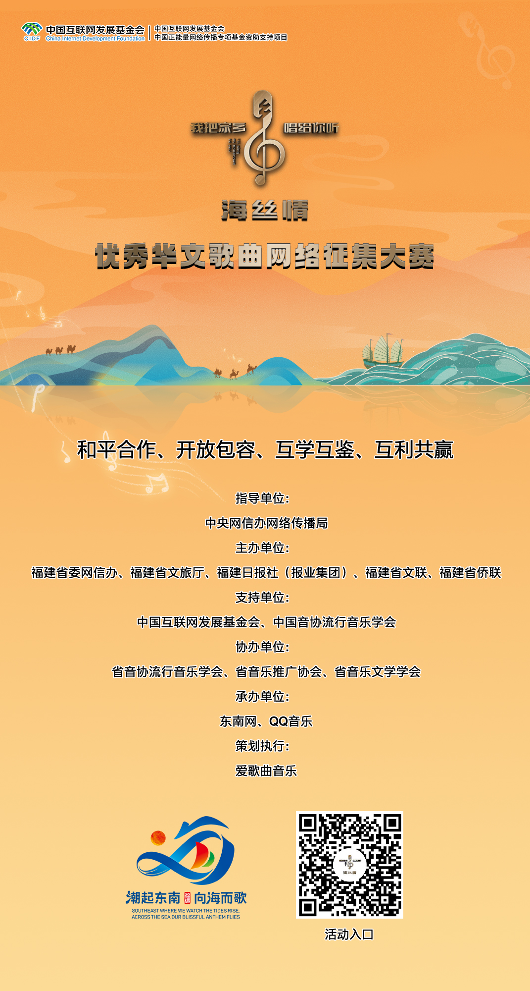 漫步在九龍江畔回望,聽(tīng)漁舟唱晚,陶醉心房; 穿山越海心手相牽,新的起點(diǎn)我們一馬當(dāng)先 …… “海絲情·我把家鄉(xiāng)唱給你聽(tīng)”優(yōu)秀華文歌曲網(wǎng)絡(luò)征集大賽正在進(jìn)行中,在參賽作品中,音樂(lè)人用詞曲寫(xiě)出了對(duì)家鄉(xiāng)的愛(ài)。大賽組委會(huì)從中挑選出優(yōu)秀作品,在東南網(wǎng)、海峽網(wǎng)等多個(gè)官方平臺(tái)進(jìn)行展播,并在抖音、視頻號(hào)、QQ音樂(lè)等平臺(tái),用媒體官方號(hào)、組委會(huì)官方號(hào)全方位推送展示。 為了能讓更多人欣賞到你的作品,請(qǐng)參賽者要認(rèn)真填寫(xiě)報(bào)名表,有歌曲視頻MV的,展播優(yōu)先。 “海絲情·我把家鄉(xiāng)唱給你聽(tīng)”優(yōu)秀華文歌曲網(wǎng)絡(luò)征集大賽,由中央網(wǎng)信辦網(wǎng)絡(luò)傳播局指導(dǎo),福建省委網(wǎng)信辦、福建省文旅廳、福建日?qǐng)?bào)社(報(bào)業(yè)集團(tuán))、福建省文聯(lián)、福建省僑聯(lián)等主辦?;顒?dòng)得到了中國(guó)互聯(lián)網(wǎng)發(fā)展基金會(huì)中國(guó)正能量網(wǎng)絡(luò)傳播專(zhuān)項(xiàng)基金資助支持。