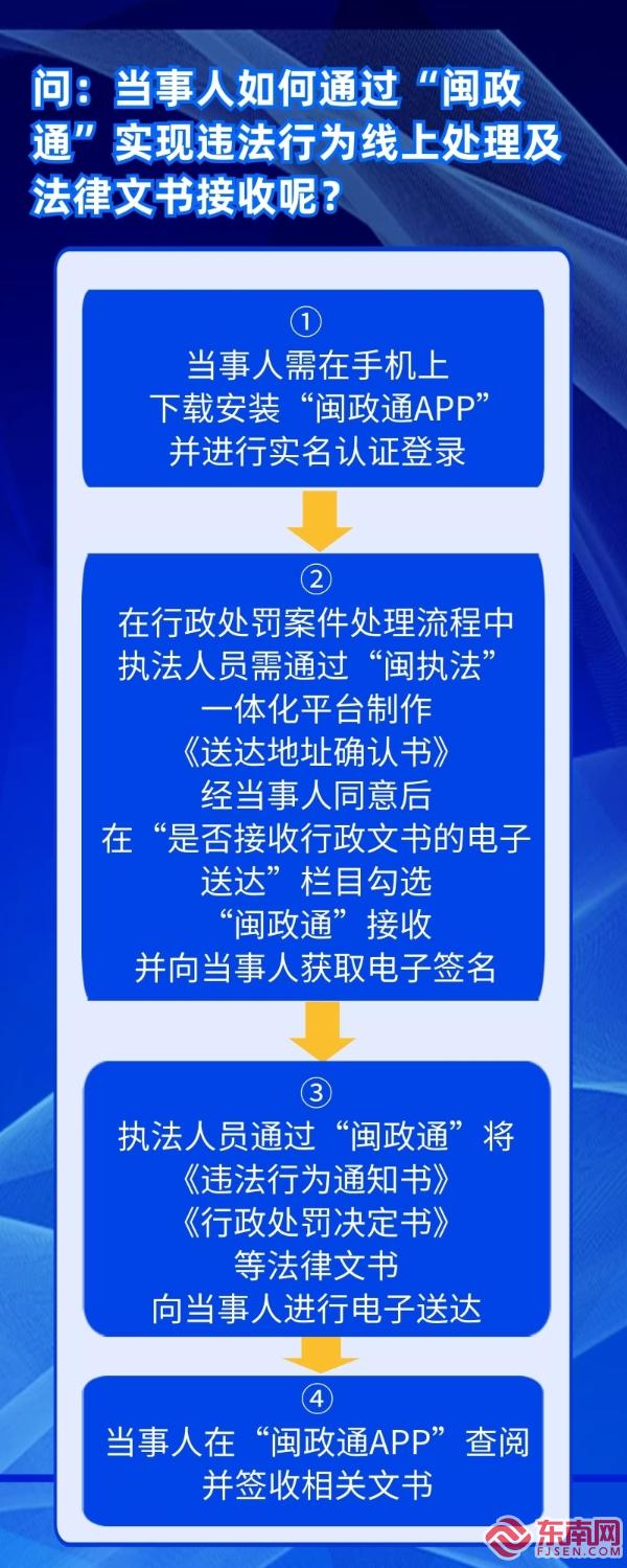 “閩政通”電子送達(dá)流程(廈門市交通執(zhí)法支隊(duì)供圖) 東南網(wǎng)2月27日訊(本網(wǎng)記者 劉瑋 通訊員 傅秋萍)日前,記者從廈門交通執(zhí)法部門獲悉,市交通執(zhí)法支隊(duì)積極推進(jìn)“閩政通”電子送達(dá),依托一體化平臺“閩政通”實(shí)現(xiàn)案件線上處理、文書電子送達(dá)、遠(yuǎn)程簽字、線上繳交罰款,完成了廈門交通執(zhí)法領(lǐng)域首單電子送達(dá)。 近期,直屬大隊(duì)調(diào)查一件12328投訴件,1月24日當(dāng)事人前來配合調(diào)查。經(jīng)核查,查明駕駛員楊某存在網(wǎng)絡(luò)預(yù)約出租汽車駕駛員無正當(dāng)理由未按承諾到達(dá)約定地點(diǎn)提供預(yù)約服務(wù)的違法行為,且是一年內(nèi)第二次違法,屬于嚴(yán)重情節(jié),應(yīng)當(dāng)給予行政處罰。 為便利當(dāng)事人接收相關(guān)文書,使群眾少跑腿,直屬大隊(duì)積極嘗試,探索通過“閩政通”APP進(jìn)行法律文書電子送達(dá)。1月26日,當(dāng)事人楊某在老家通過其“閩政通”對《違法行為通知書》《行政處罰決定書》等文書進(jìn)行線上遠(yuǎn)程電子簽收并予以繳款,極大優(yōu)化群眾辦事體驗(yàn)感。 當(dāng)事人如何通過“閩政通”實(shí)現(xiàn)違法行為線上處理及法律文書電子送達(dá)?相關(guān)執(zhí)法人員介紹,首先,當(dāng)事人需在手機(jī)上下載安裝“閩政通APP”,進(jìn)行實(shí)名認(rèn)證登錄。其次,在行政處罰案件處理流程中,執(zhí)法人員需通過“閩執(zhí)法”一體化平臺制作《送達(dá)地址確認(rèn)書》,經(jīng)當(dāng)事人同意后在“是否接收行政文書的電子送達(dá)”欄目勾選“閩政通”接收,并向當(dāng)事人獲取電子簽名。最后,執(zhí)法人員制作并審批《違法行為通知書》《行政處罰決定書》后就可以通過“閩政通”實(shí)現(xiàn)電子送達(dá),當(dāng)事人可在“閩政通APP”查閱并簽收相關(guān)文書。 “通過‘閩政通’進(jìn)行案件文書電子送達(dá)能夠?qū)崿F(xiàn)文書的即時傳遞,比傳統(tǒng)的直接送達(dá)、郵寄送達(dá)更高效、更便捷,違法當(dāng)事人可隨時隨地獲取、查閱文書內(nèi)容?!眻?zhí)法人員說,電子送達(dá)記錄還可追蹤和查詢,有效避免紙質(zhì)文書在傳遞途中可能出現(xiàn)的損毀、遺失以及信息泄露等問題。 |