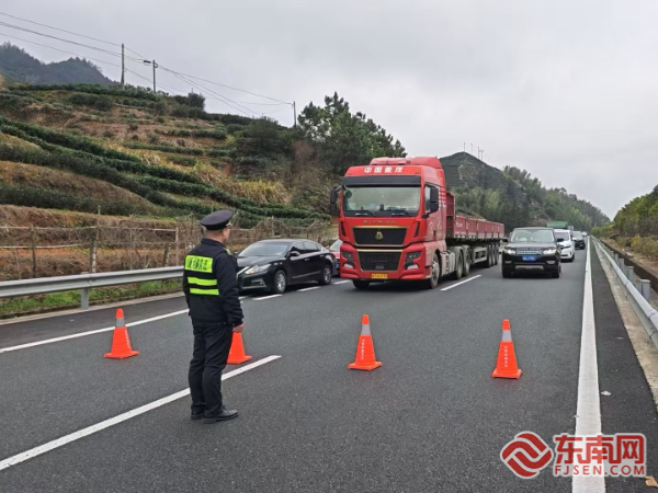 執(zhí)法人員協(xié)助交警進(jìn)行交通管制。寧德高速執(zhí)法支隊(duì)供圖 事故車輛側(cè)翻橫亙于車道之間,車體嚴(yán)重變形,路面出現(xiàn)燃油滲漏。執(zhí)法人員迅速聯(lián)合交警、養(yǎng)護(hù)等部門對(duì)事故區(qū)域?qū)嵤┡R時(shí)交通管制,在隧道入口及沿線通過可變情報(bào)板發(fā)布警示信息,引導(dǎo)后方車輛減速避讓,并對(duì)滯留司乘人員耐心開展現(xiàn)場(chǎng)解說,說明事故情況及安全注意事項(xiàng),緩解群眾焦慮情緒。同時(shí),執(zhí)法人員協(xié)助救援力量對(duì)被困人員展開施救,利用反光錐筒、警示燈等設(shè)備對(duì)現(xiàn)場(chǎng)進(jìn)行安全布控,防止次生事故發(fā)生。救援過程中,執(zhí)法人員同步對(duì)事故造成的路產(chǎn)損失進(jìn)行詳細(xì)勘驗(yàn),固定現(xiàn)場(chǎng)證據(jù),為后續(xù)處置提供依據(jù)。