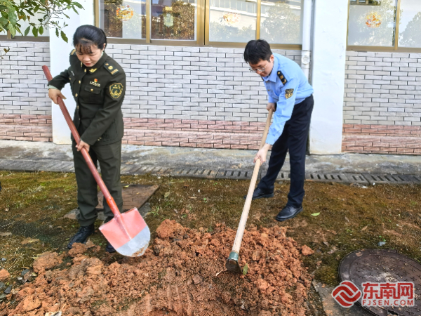 開展聯(lián)合植樹活動。寧德高速執(zhí)法支隊供圖 下午3時,雙方職工在壽寧征管所院內(nèi)揮鍬培土,開展義務植樹。扶苗填坑、提水澆灌的勞作場景熱火朝天,不到一小時,十余株新栽的石楠在春風中舒展枝條?!斑@些樹苗將與我們的巡查車共同守護這條道路的平安。”執(zhí)法人員吳步升擦拭著額頭的汗水說道。
