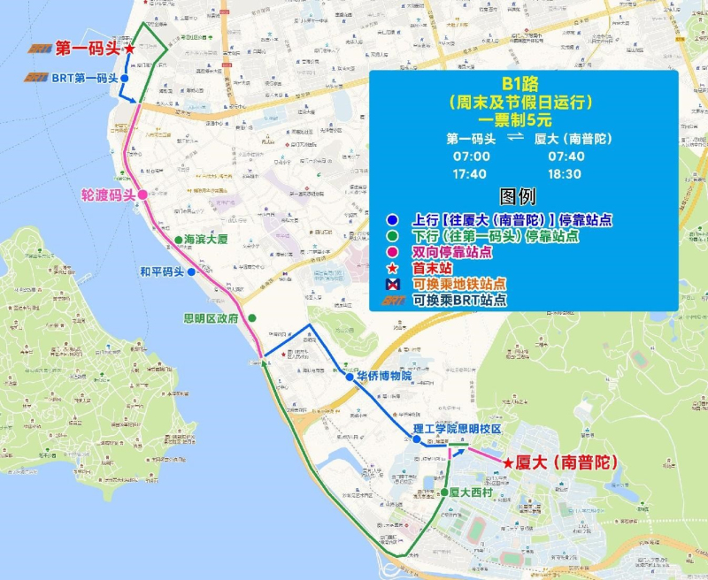 B1路:鷺江漫游線 以“騎樓琴音·鷺江風(fēng)情”為主題,B1路串聯(lián)鼓浪嶼、中山路、廈門大學(xué)、南普陀等景點(diǎn),帶游客漫游老城區(qū),感受廈門的歷史韻味。
