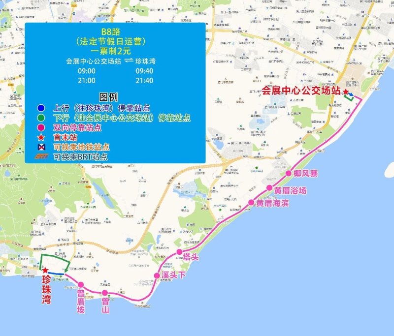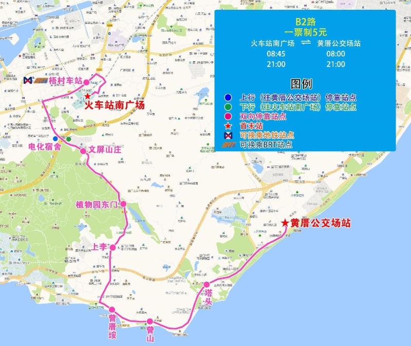 B2路:山海躍動(dòng)線 以“穿山越?!こ且敖豁憽睘橹黝},B2路翻越萬(wàn)石山,連接廈門火車站、植物園、曾厝垵等地,展現(xiàn)山海穿越與自然人文交融的獨(dú)特魅力。