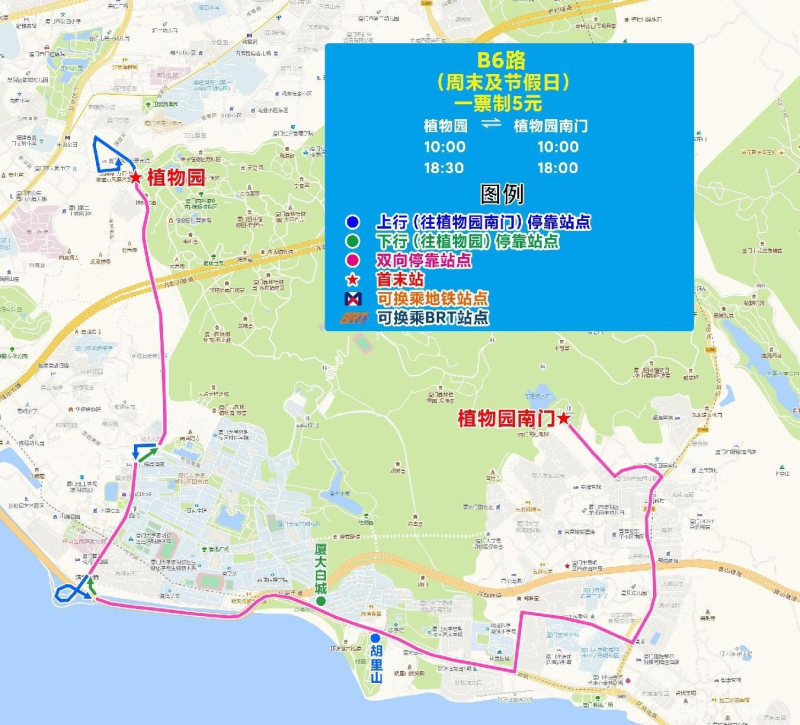 B6路:青山翠谷線 以“山海穿梭·萬(wàn)石涵翠”為主題,B6路便捷往返植物園,串聯(lián)廈大白城、胡里山炮臺(tái)等景點(diǎn),展現(xiàn)山海交融的自然風(fēng)光。