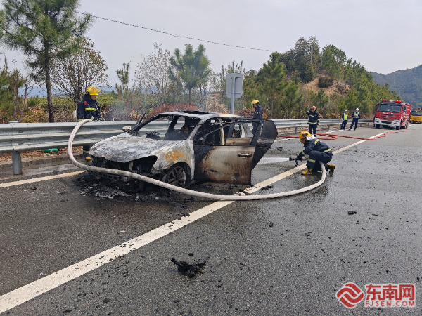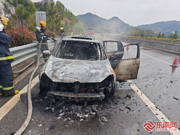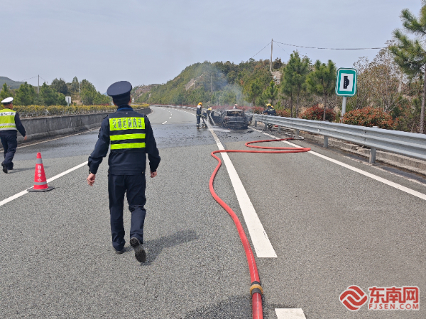 事故現(xiàn)場。寧德高速執(zhí)法支隊供圖 抵達現(xiàn)場后,執(zhí)法人員和高速交警立即對事故現(xiàn)場進行交通管制,疏散周圍車輛和人員,防止次生事故的發(fā)生。消防隊員迅速展開滅火行動,利用專業(yè)消防設備對起火車輛進行撲救。經過緊張救援,明火最終被成功撲滅,所幸此次事故未造成人員傷亡。