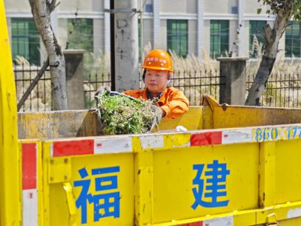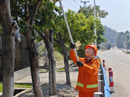 鄭文在G228線修剪路樹(連江公路中心供圖) 在巡查過程中,鄭文發(fā)現(xiàn)部分行道樹因近期雨水充沛而枝繁葉茂,已有枝條遮擋了交通標志牌,甚至探入車道,影響通行安全。遇此情況,他沒有片刻猶豫,立即拿起修剪工具,戴好手套、系緊安全帶,麻利地開始作業(yè)?!班嵨氖?,我來吧,您歇會兒。”身邊的年輕同事林晟見狀連忙上前勸他歇一歇。他卻只是笑著擺擺手:“我干習慣了,放心。”陽光透過樹葉灑在他的身上,那雙經(jīng)歷了歲月打磨的手,依舊穩(wěn)健有力,修剪動作干凈利落、不留死角。排除完安全隱患后,他又背起工具,踏上下一段巡查路程,一如往昔。