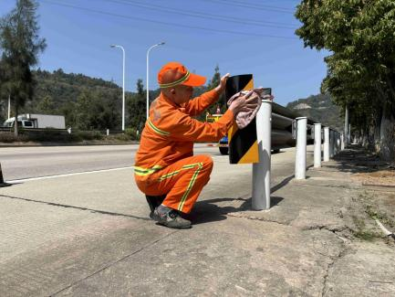 鄭文在G228線擦洗沿線設(shè)施(連江公路中心供圖) “只要路還在,就得有人守。”鄭文常這樣說。哪怕風雨交加,哪怕節(jié)假日當班,只要路面有情況,他總是第一時間沖上前。2023年7月,強臺風“杜蘇芮”侵襲福建,連江境內(nèi)風雨交加,G228線浦口鎮(zhèn)官嶺村附近路段大樹倒伏,占據(jù)整個車道,造成交通中斷。災情發(fā)生后,鄭文與同事第一時間趕赴現(xiàn)場,在狂風驟雨中冒雨作業(yè)。他們穿著雨衣、打著手電,將倒伏的大樹一一鋸斷、拖移、清運,一直忙到深夜才疏通道路。當?shù)谝惠v車安全通過時,鄭文摘下沾滿雨水的安全帽,那雙布滿血絲的眼睛中,閃爍著疲憊卻滿足的光芒。
