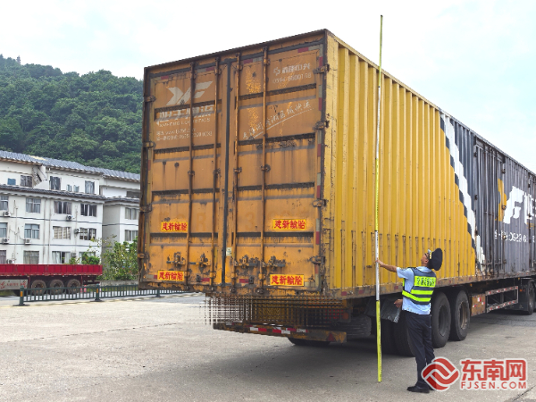測量貨車高度。寧德高速執(zhí)法支隊(duì)供圖 行動(dòng)中,執(zhí)法人員與交警密切協(xié)作,依托福安收費(fèi)站對(duì)過往車輛進(jìn)行“全覆蓋式”檢查,重點(diǎn)針對(duì)危化品運(yùn)輸車輛、出租車、班線客運(yùn)及貨運(yùn)車輛開展專項(xiàng)檢查。當(dāng)日共檢查車輛20輛,發(fā)現(xiàn)2起超限超載違法行為:其中1輛貨車超限超載情況嚴(yán)重,執(zhí)法人員依法對(duì)其作出罰款等行政處罰決定,要求駕駛員足額繳納罰款,并通過卸載等方式消除違法狀態(tài)后,方可繼續(xù)上路行駛;另一輛貨車雖存在輕微超限情形,但符合“輕微不罰”規(guī)定,執(zhí)法人員對(duì)駕駛員進(jìn)行批評(píng)教育,幫助其認(rèn)識(shí)超限超載的危害性。