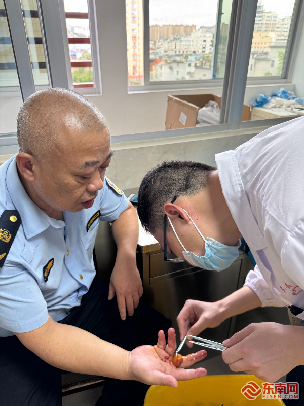 執(zhí)法員處理傷口。寧德高速公路行政執(zhí)法支隊供圖 救援過程中,高方彬同志以極高的專業(yè)素養(yǎng)與臨危不懼的勇氣一把抓起消防水龍頭,毫不猶豫地沖向火場。在緊張激烈的撲救過程中,他的手指不慎被水龍頭上的鐵片劃傷,鮮血頓時染紅手掌。但高方彬同志強忍著劇痛,堅守在滅火最前線,與其他救援人員并肩作戰(zhàn)。 經(jīng)過近一小時的奮力撲救,火勢最終被完全控制并徹底撲滅。在整個救援過程中,三大隊執(zhí)法人員與消防隊員密切配合,高效處置火情,有力保障了服務區(qū)內人員和財產(chǎn)安全。 此次火災雖事發(fā)突然,但在執(zhí)法人員和消防隊員的迅速響應和科學處置下,火情得到及時控制。事故未造成人員傷亡和重大財產(chǎn)損失,但也再次警示廣大駕駛員和運輸企業(yè):務必嚴格遵守交通安全法規(guī),加強貨物裝載和運輸環(huán)節(jié)的安全管理,確保行車安全。 |