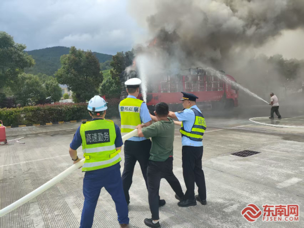 執(zhí)法員撲滅火情。寧德高速公路行政執(zhí)法支隊供圖 執(zhí)法人員抵達現(xiàn)場時,發(fā)現(xiàn)車牌號為皖LG8790的貨車正被大火吞噬。若不及時控制火勢,將嚴重威脅服務區(qū)內人員和車輛的安全。面對險情,屏南中隊高方彬、鄭武沉著應對,迅速與消防隊員制定救援方案。