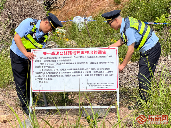 路域環(huán)境整治。寧德高速執(zhí)法支隊供圖 針對排查出的隔離設施破損點及存在墜落、穿越風險的安全隱患區(qū)域,工作組規(guī)范設置了醒目的警戒線,并在關鍵位置豎立了禁止侵占、注意安全的公告牌,明確管理要求,強化警示效果。為強化源頭治理,執(zhí)法人員同步深入沿線村莊開展普法宣傳,向村民講解公路法律法規(guī),明確違法危害,引導自覺維護路域環(huán)境。