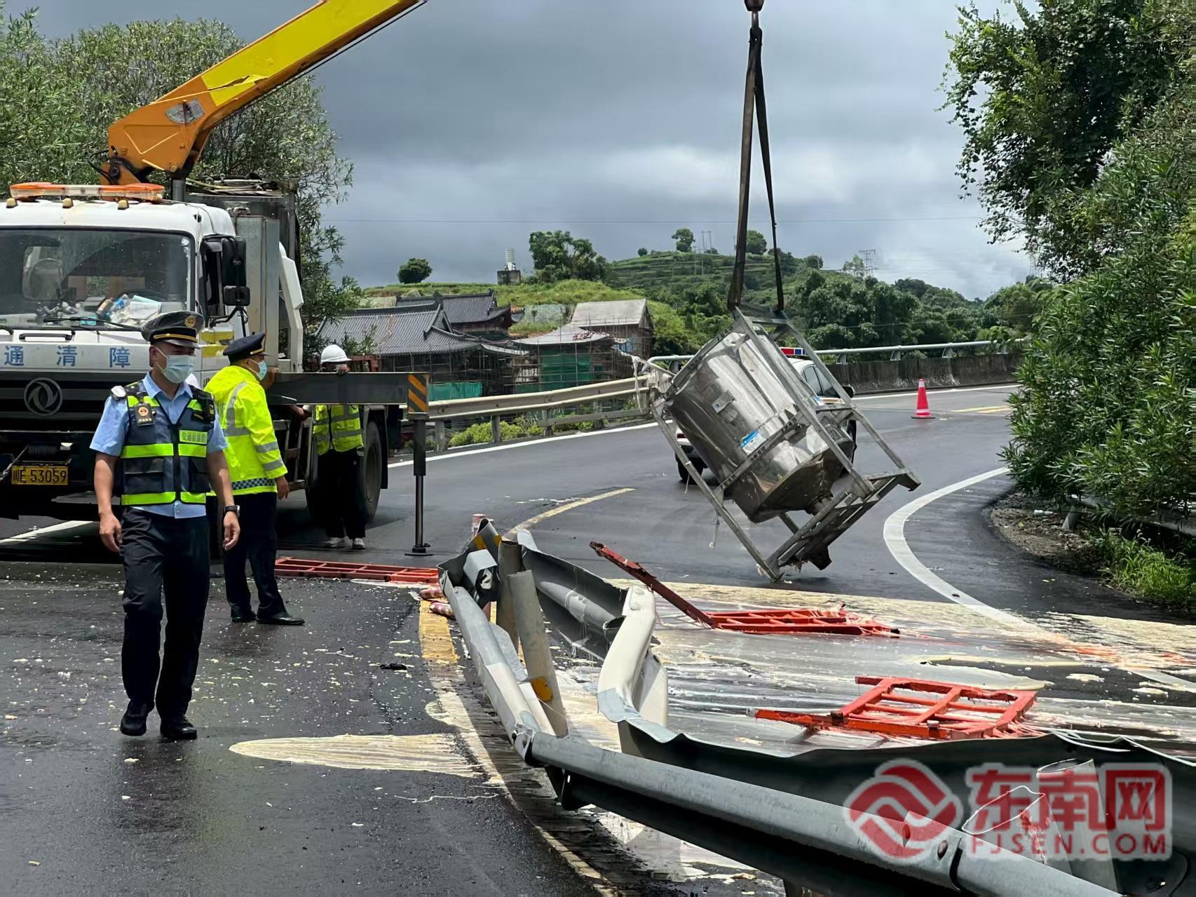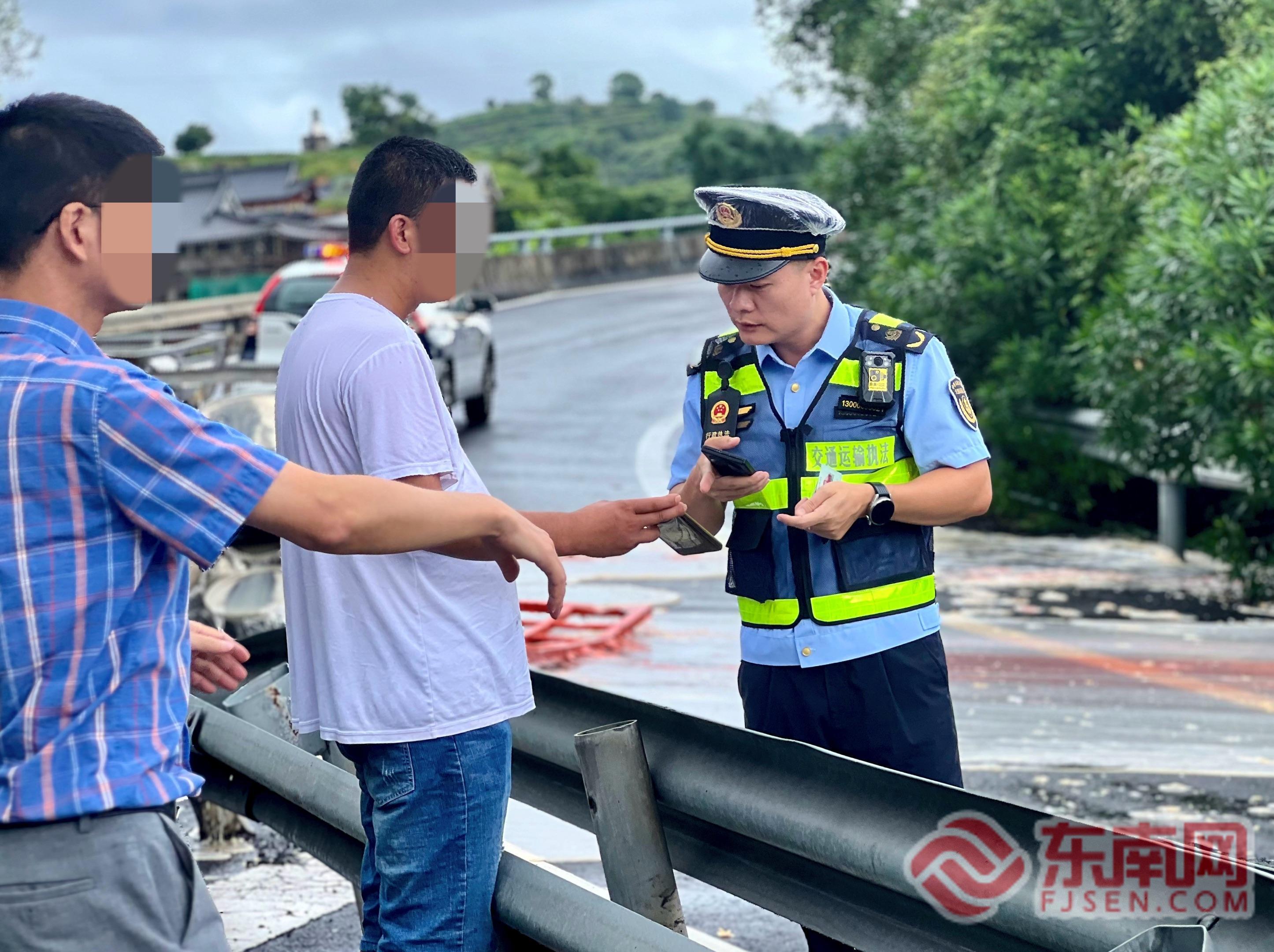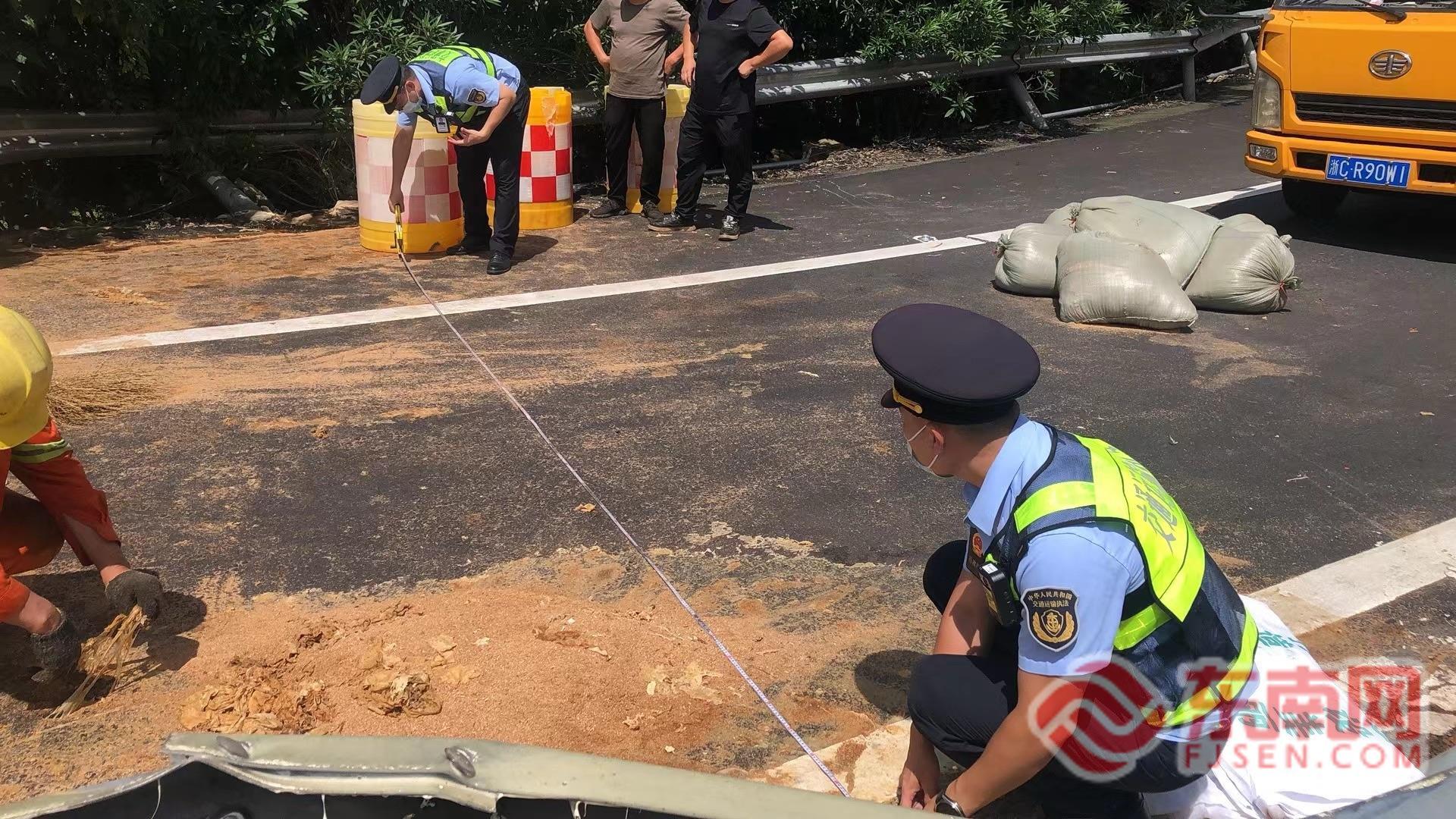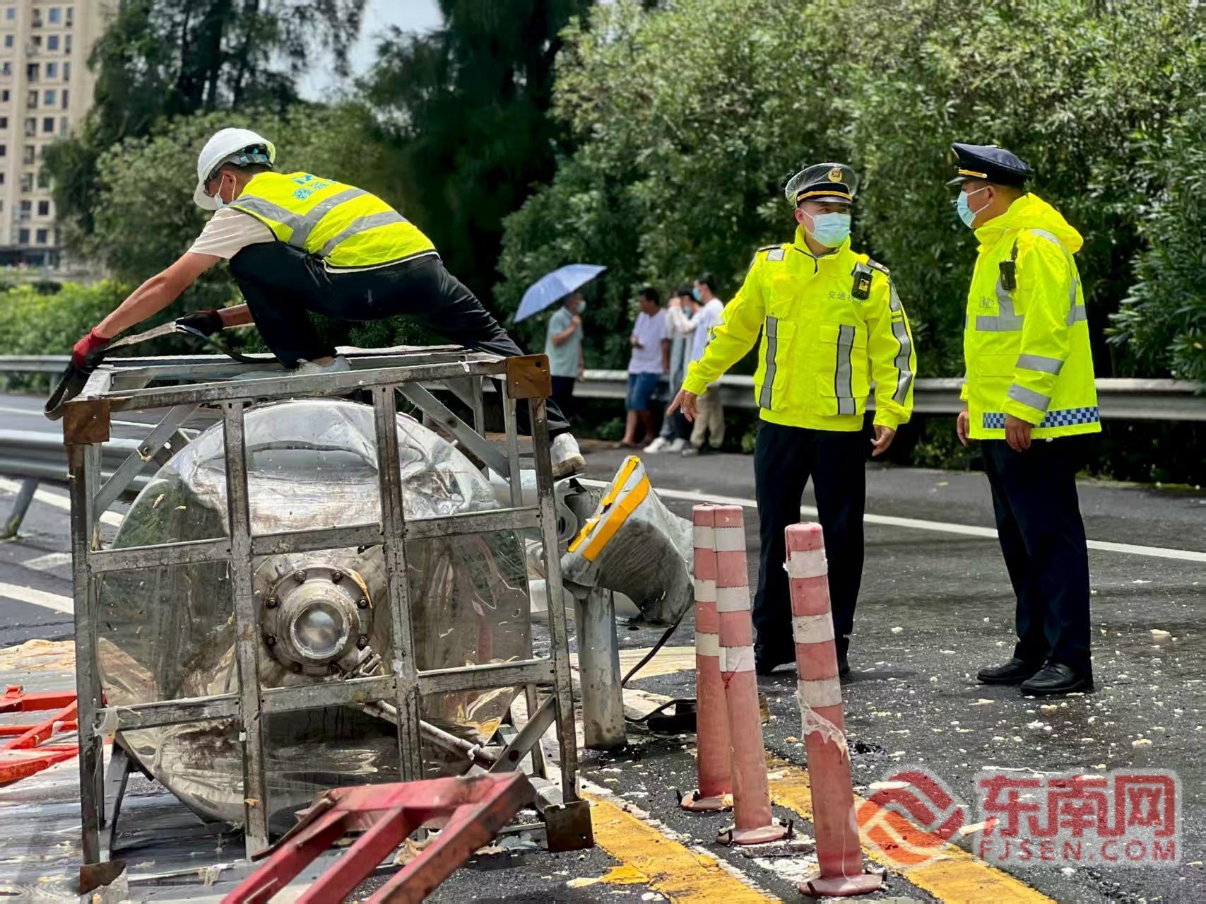 散落?;逢懤m(xù)調(diào)離 接警后,寧德高速執(zhí)法支隊立即啟動應(yīng)急預(yù)案,迅速聯(lián)動消防、高速交警等相關(guān)部門火速趕赴現(xiàn)場。執(zhí)法人員抵達后發(fā)現(xiàn),一輛運載20噸聚氨酯樹脂的貨車所載貨物散落路面,部分桶體破損導(dǎo)致聚氨酯樹脂大量泄漏。粘稠刺鼻的樹脂堆積在車道內(nèi),造成路產(chǎn)損壞,現(xiàn)場彌漫濃烈異味,存在安全與環(huán)境污染雙重風(fēng)險。事故車輛占據(jù)匝道,嚴重影響通行安全,駕駛員因貨物損失及險情情緒十分激動。