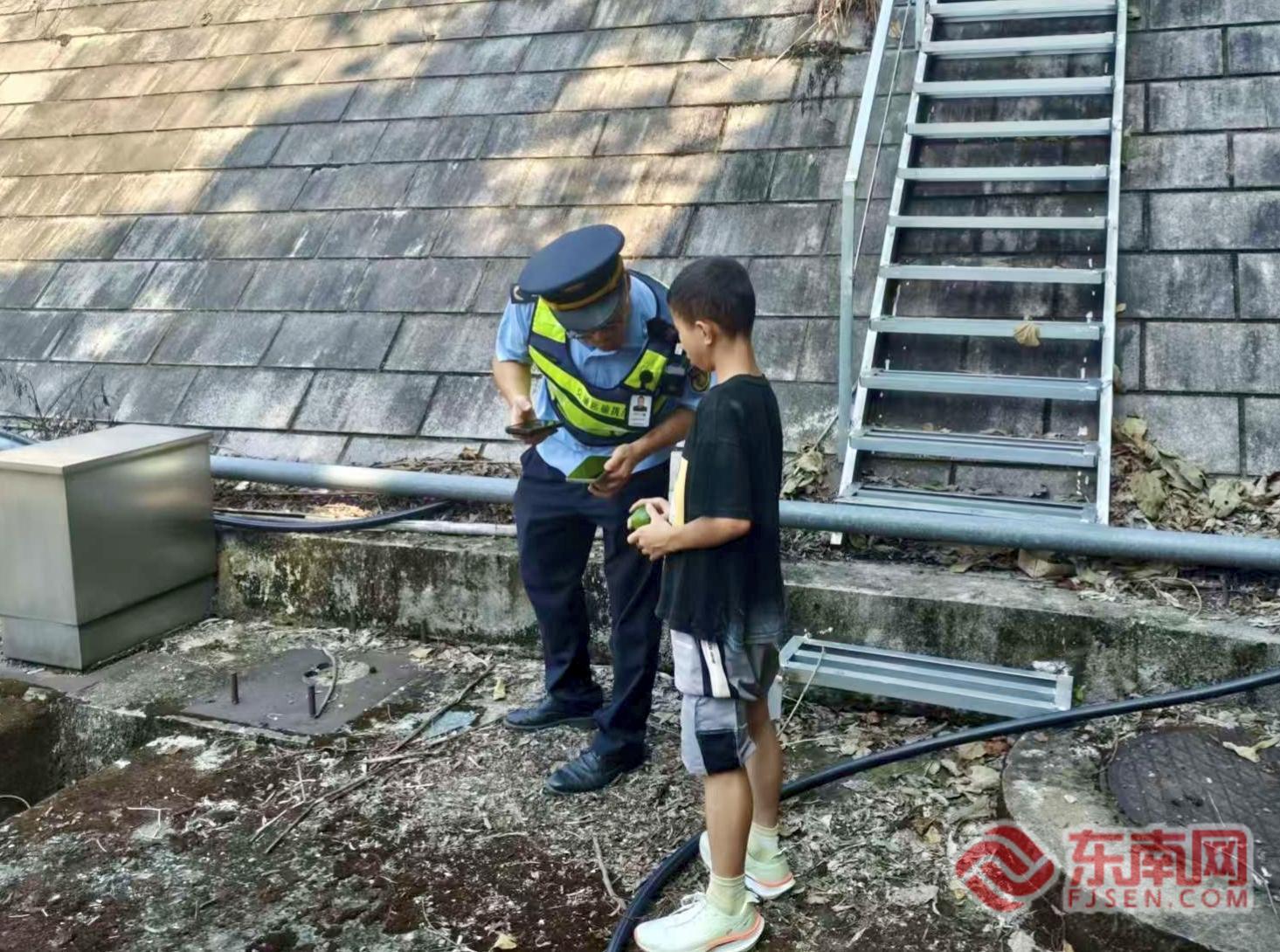 勸離高邊坡玩耍少年。寧德高速公路行政執(zhí)法支隊供圖 執(zhí)法人員立即靠邊停車,迅速做好現(xiàn)場安全布控,隨后上前將少年引導(dǎo)至護欄外的安全區(qū)域。經(jīng)耐心安撫與詢問,得知該少年是附近白巖村的村民,因天氣炎熱,在隧道口臺階處休息,并未意識到自己已身處險境。