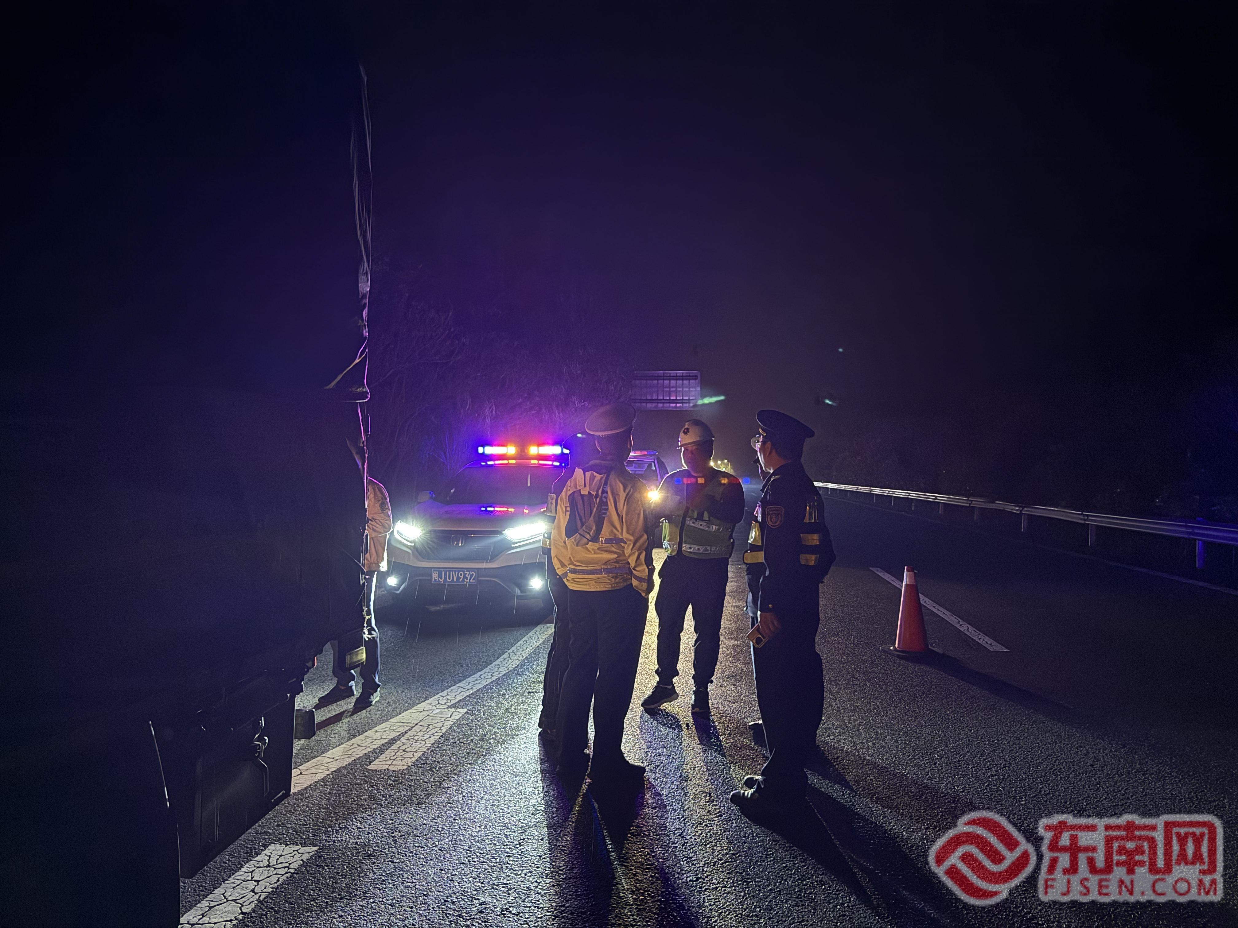 多部門現(xiàn)場商議對策。寧德高速執(zhí)法支隊供圖 寧德高速執(zhí)法支隊周寧中隊迅速趕赴現(xiàn)場處置,第一時間在來車方向設警示標志、鳴警報示,隨后與交警、路勤分工協(xié)作,引導肇事車至緊急停車帶,手持照明設備清理關鍵區(qū)域,快速開辟出快車道供車輛通行,同時專人在隧道入口定點引導車流,避免交通擁堵加劇。