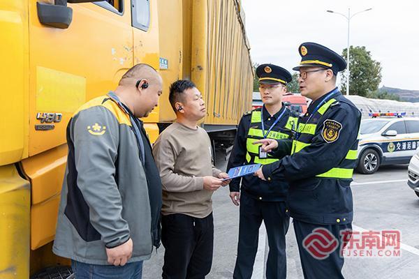 執(zhí)法人員聯(lián)合交警在服務(wù)區(qū)對(duì)貨車司機(jī)開展憲法宣傳。寧德高速公路行政執(zhí)法支隊(duì)供圖 作為京臺(tái)高速福建段的重要交通樞紐,古田收費(fèi)站和五華山服務(wù)區(qū)人流、車流密集,是開展普法宣傳的關(guān)鍵陣地?;顒?dòng)前,三大隊(duì)精心謀劃部署,結(jié)合高速公路執(zhí)法工作實(shí)際,梳理憲法核心內(nèi)容、交通運(yùn)輸領(lǐng)域法律法規(guī)及群眾高頻咨詢問(wèn)題,制作了圖文并茂的宣傳手冊(cè)、海報(bào)等資料,同時(shí)整合LED顯示屏、咨詢服務(wù)臺(tái)等宣傳資源,構(gòu)建“線上+線下”“固定+流動(dòng)”的立體宣傳格局,確保宣傳工作精準(zhǔn)高效。