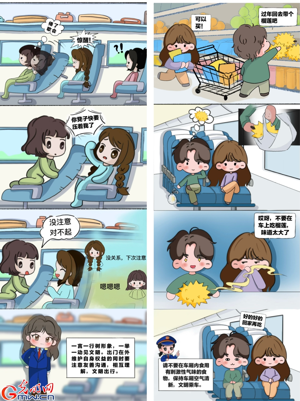 山河遠闊、人間煙火。向著故鄉(xiāng)的方向奔赴,永遠是中華兒女的春節(jié)執(zhí)念,一場春運讓天南地北客都行走在回家的路上。今年春節(jié)假期有8天,這也讓更多的人有了假期出游的打算。既然是出行,文明一定是繞不開的話題。新春佳節(jié)釋放了人們回家過年和外出游玩的潛力,也帶來了諸多文明考題,尤其是面對著是數(shù)十億次的人口遷徙。 新建線路開始投入運營,各種黑科技助力旅客出行,車廂內(nèi)各式各樣的文化表演……從今年春運的感知上看,一路上都有溫暖的流動風(fēng)景。也要看到,一些人的不文明行為,偏偏打擾了大家“在路上”的幸福感。都說“文明如水,潤物無聲”,這種無聲,恰恰是文明在每個人內(nèi)心的遵從。隨著社會經(jīng)濟的發(fā)展,國民文明素質(zhì)得以整體提升,出行路上的文明之美也隨處可見——不在高鐵車廂吸煙、不在地鐵上吃東西等行為,都已經(jīng)成為公共交通空間里的約定俗成。絕大多數(shù)人都愿意用自己的小心翼翼去守護出行途中的文明風(fēng)景,而不是被一小撮人的行為無端打擾了興致。這種進步,我們亦盡收眼底。 春運路上,將“文明”放入行囊,這不僅僅是每個人的行為自覺,也是有關(guān)部門的勠力所向。近日來,一場場“溫馨春運、文明相伴”主題宣傳活動在上海虹橋站、廣州白云站等車站候車大廳舉行,書法家揮毫潑墨,文藝骨干送上“文化大餐”,講解員宣講出行注意事項,引來往來旅客的駐足和參與。在積極互動之中,完成了文明出行的耳濡目染。倡導(dǎo)文明出行,讓流動的中國更有溫度,關(guān)于它的一言一行,都是力量!(文字:謝偉鋒 漫畫:丁楊影) |