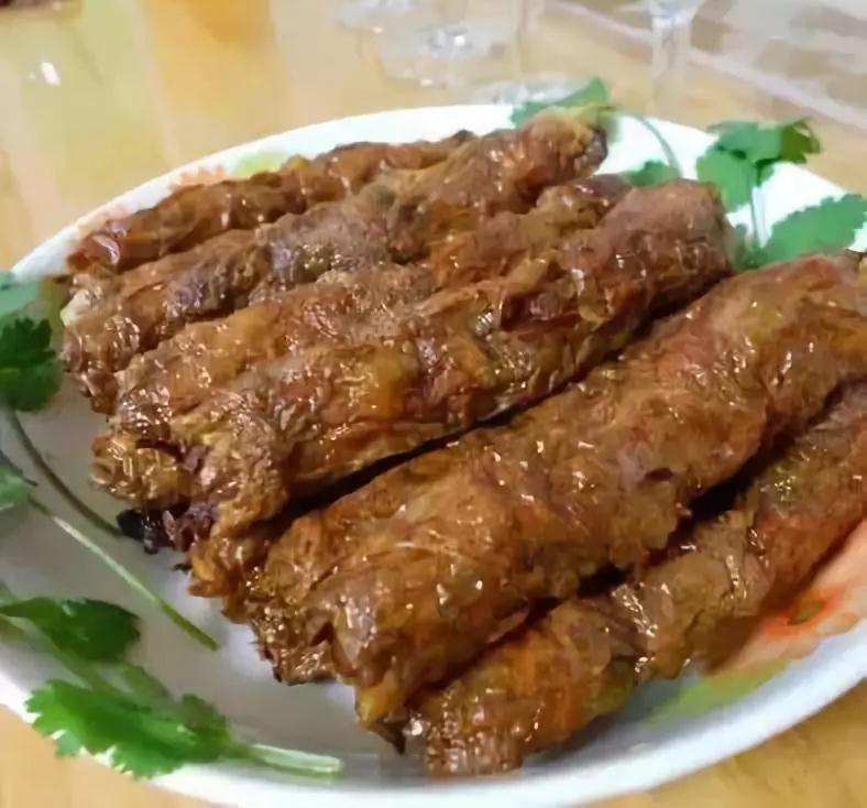 它用豆皮,裹上剁碎的精肉、荸薺、蔥等,包成條狀,再放下油鍋炸成焦黃,切成幾段,蘸佐料進食,香、酥、脆、鮮,妙不可言。