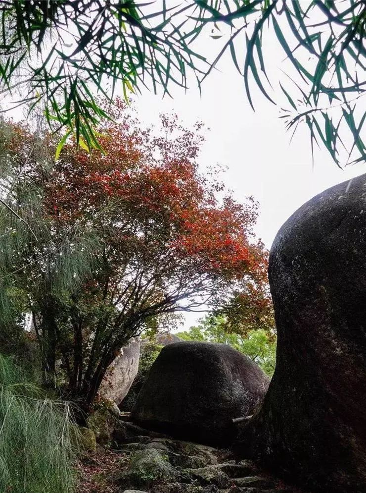 謝雨真 攝 紅葉灑落在石階、石頭縫、小山包上,堆了一疊又一疊。五裂槭的枝干上,還掛著許多的紅葉,有的紅葉已經(jīng)完全變色,有的泛黃,還有的正開始要起變化,黃葉上透著斑點(diǎn)的紅色。這些紅葉把整個(gè)山包渲染得詩(shī)情畫意。